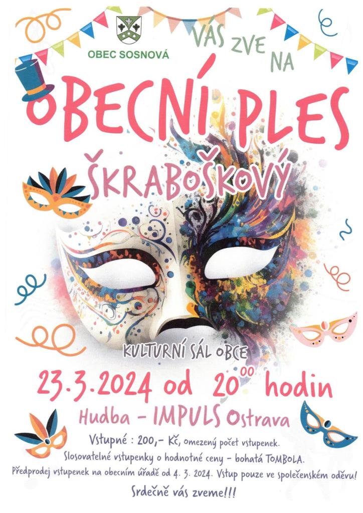 Dne 23.03.2024 proběhl v naší vesničce OBECNÍ PLES, tentokrát se škraboškami. Děkujeme všem zúčastněným za velmi povedenou akci. Hudba v podání IMPULS Ostrava.