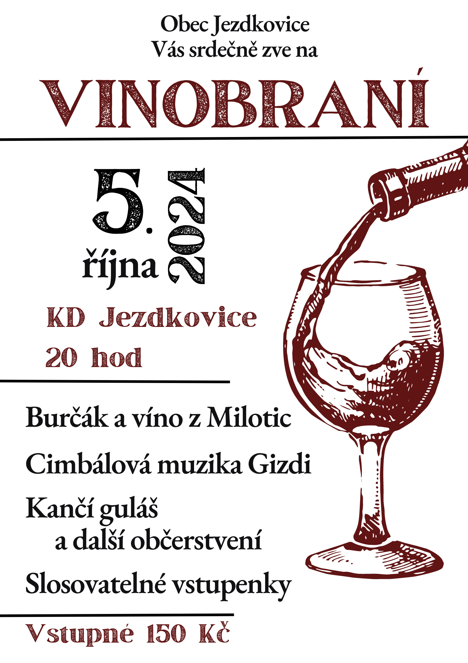 Obec Jezdkovice Vás srdečně zve na VINOBRANÍ 5.10.2024 od 20:00 hod. v kulturním domě. Vstupné 150 Kč. Můžete se těšit na cimbálovou muziku GIZDI, taneční vystoupení, burčák a víno z Milotic.